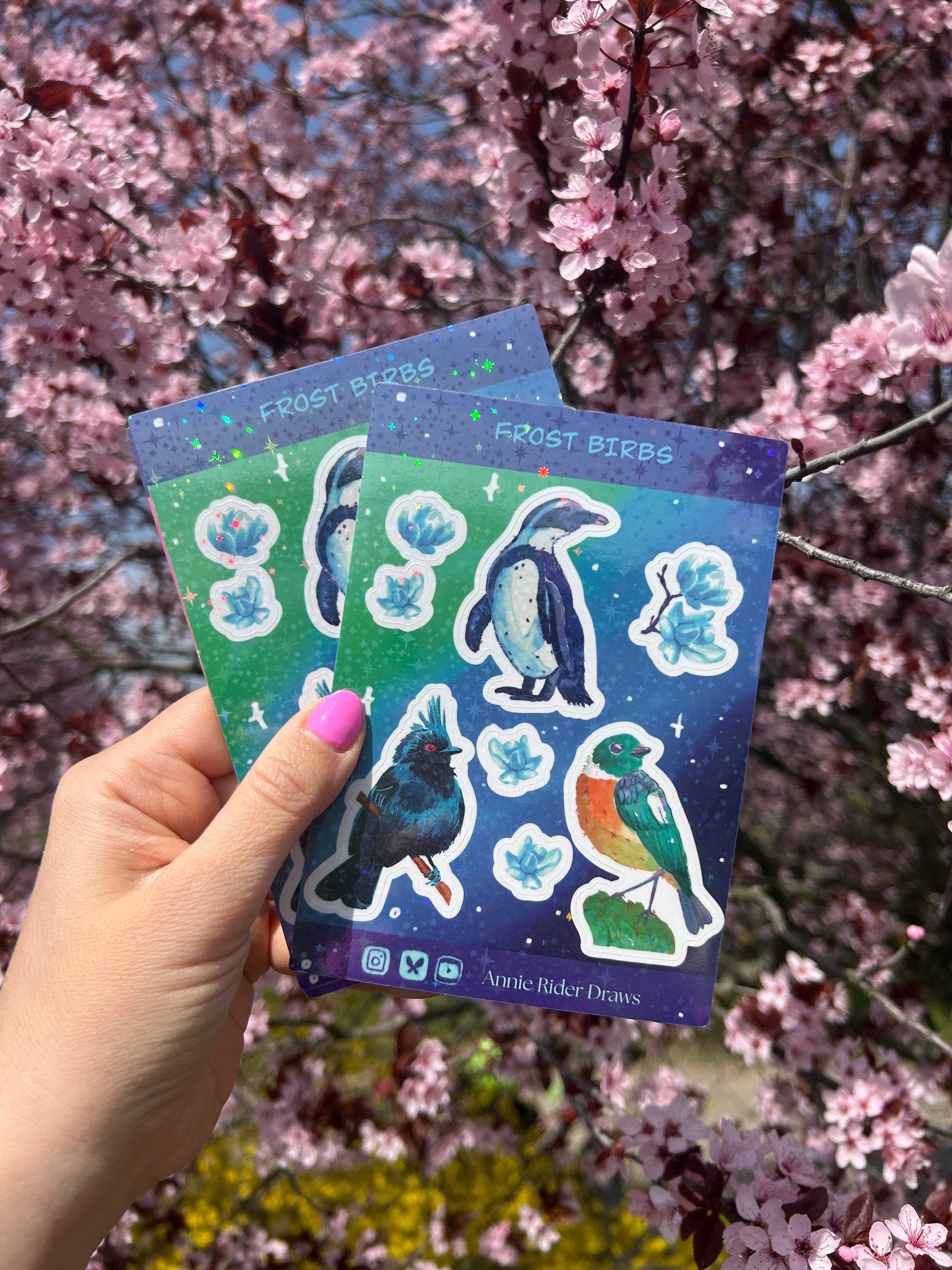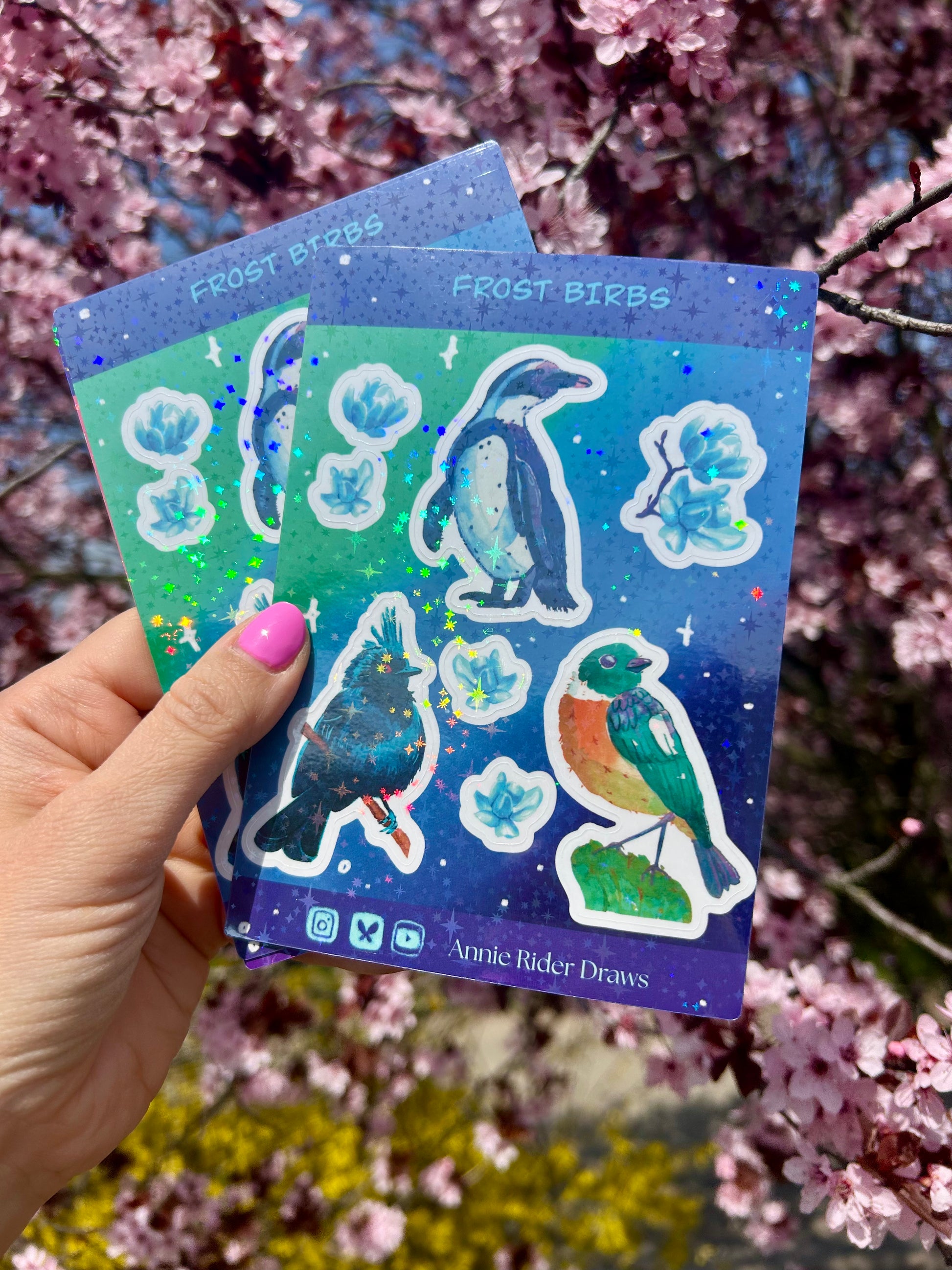 "Fagyos madarak" tartós vinyl matrica csillagos hologram-papírra nyomtatva, fényes lakkal bevonva, három madárral és magnólia díszítéssel.