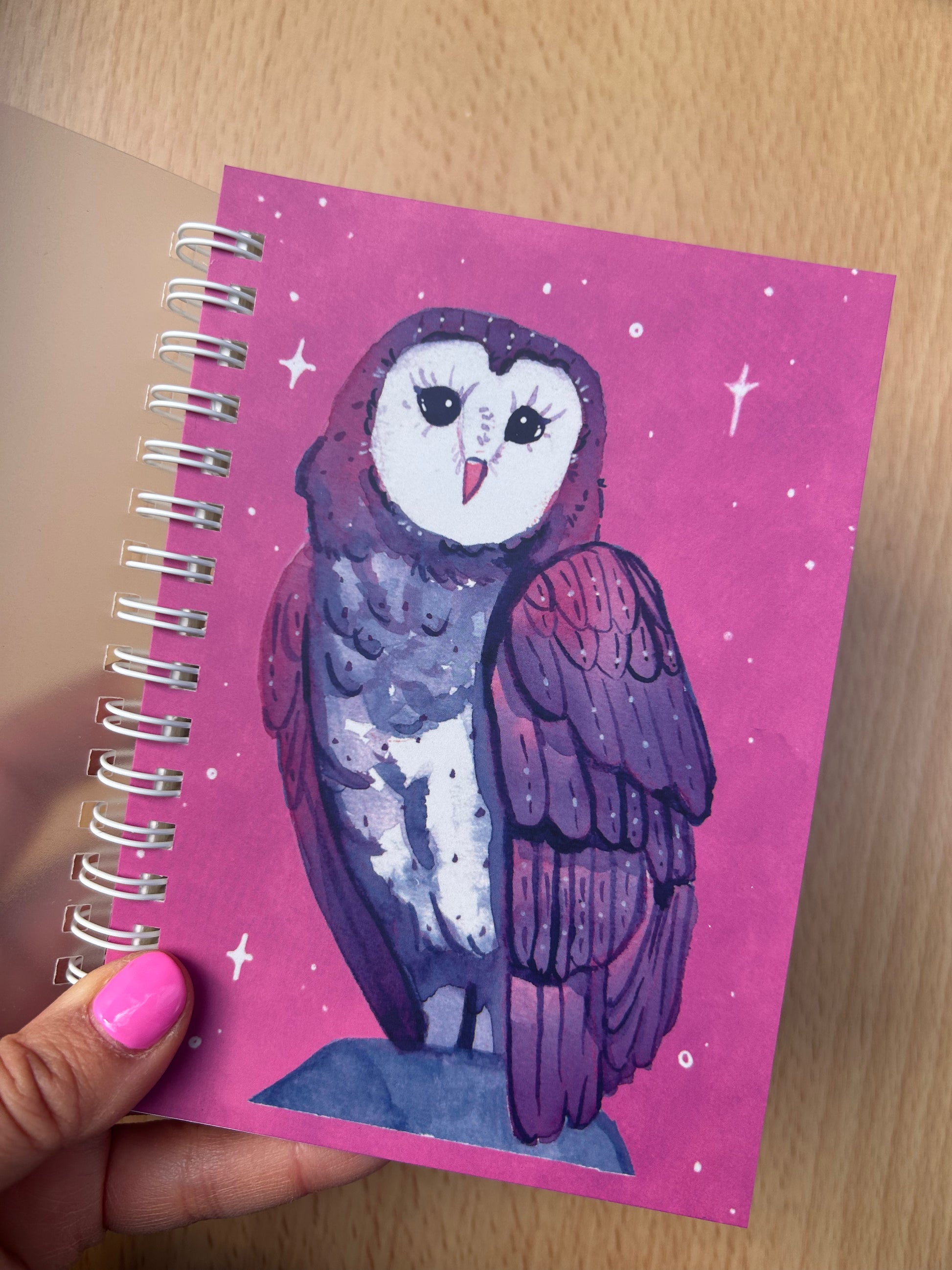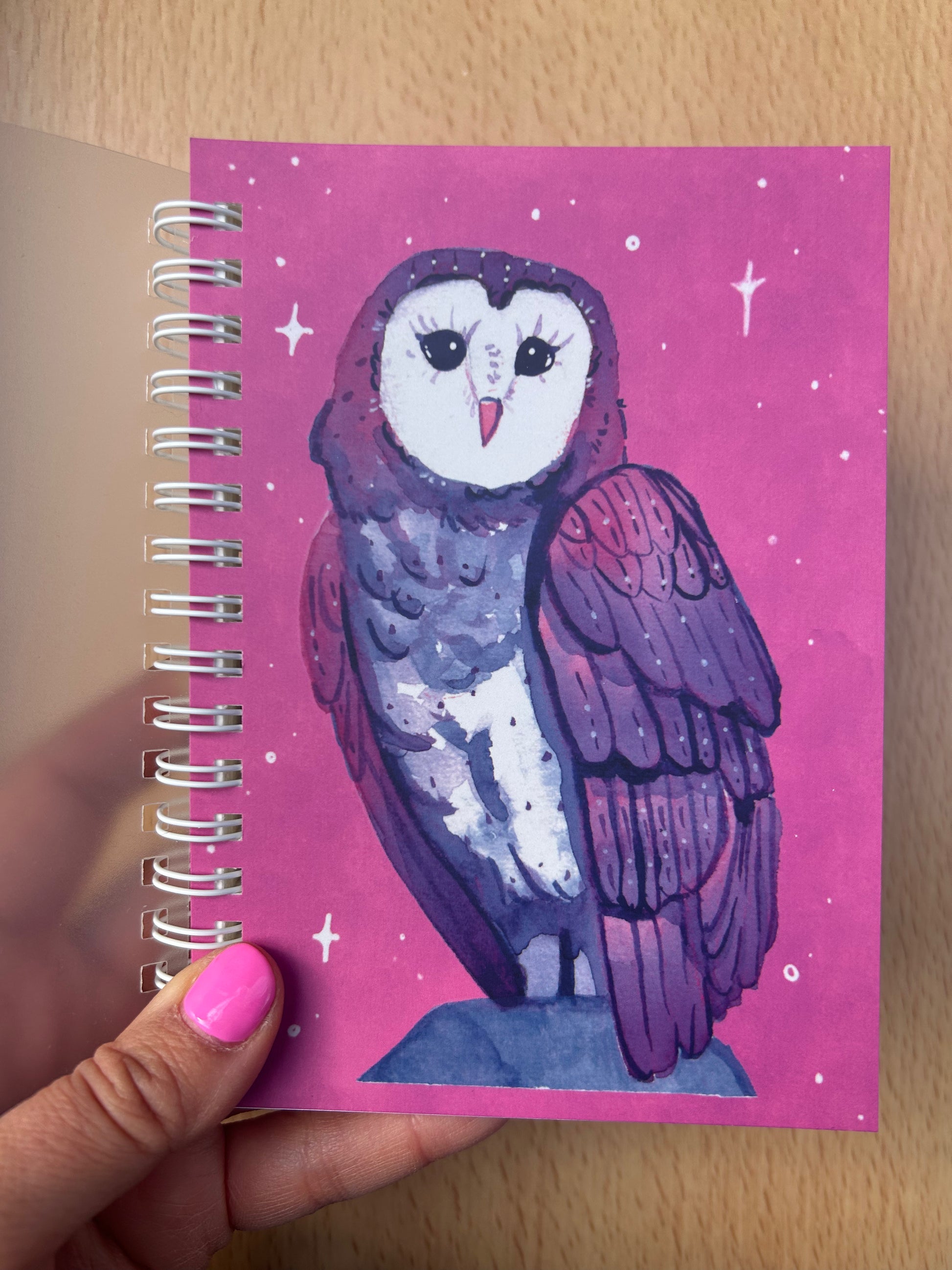 A6-os méretű spirálozott notesz sima oldalakkal: rajzoláshoz, jegyzeteléshez. Borítóján egyedi, japán Gansai Tambi vízfestékkel festett "Gyöngybagoly" illusztráció. A külső borítót egy plexi lap védi a gyűrődéstől, kosztól.
