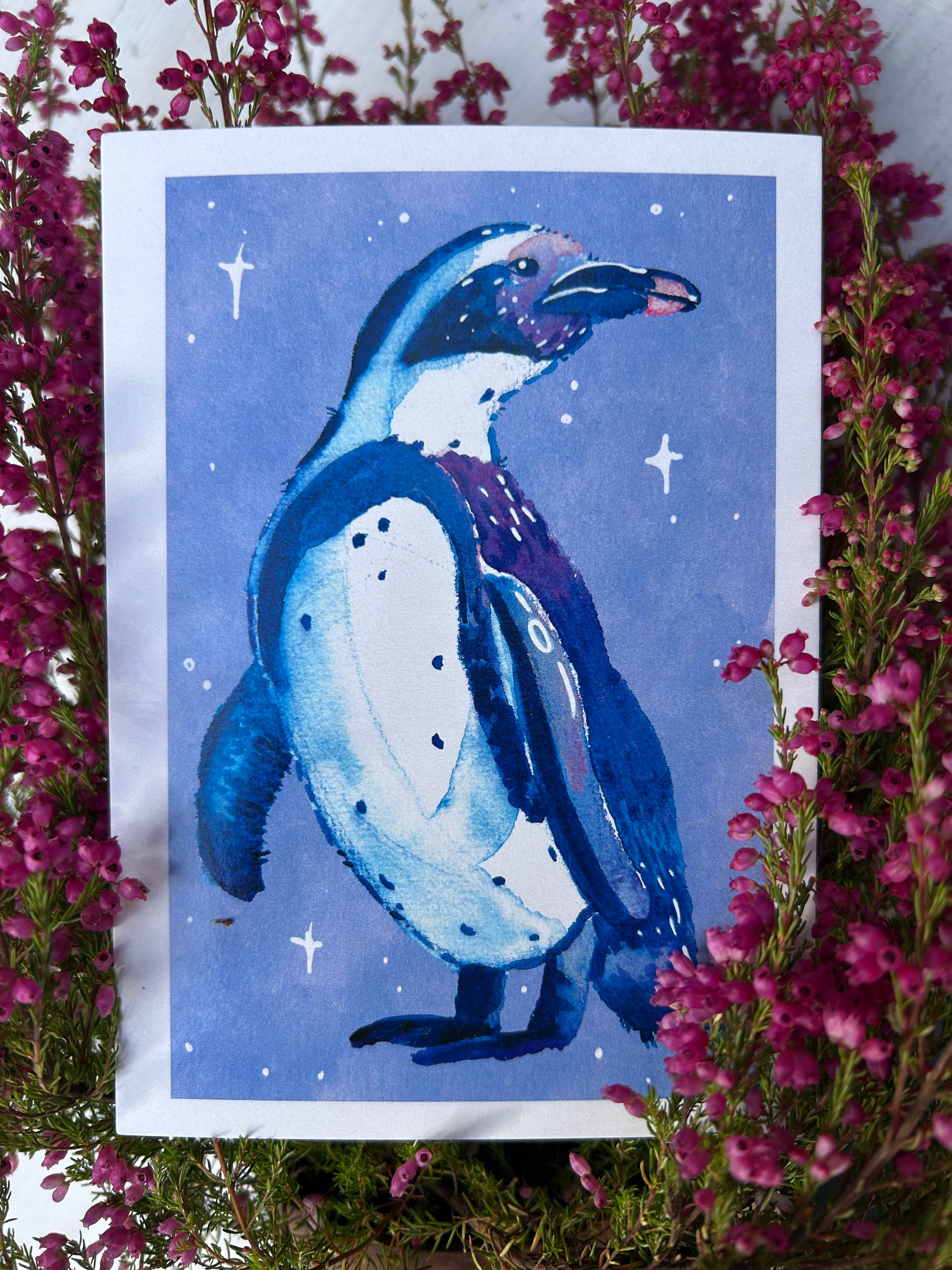 Egyedi, japán Gansai Tambi vízfestékkel festett "Magellán-pingvin" képeslap.