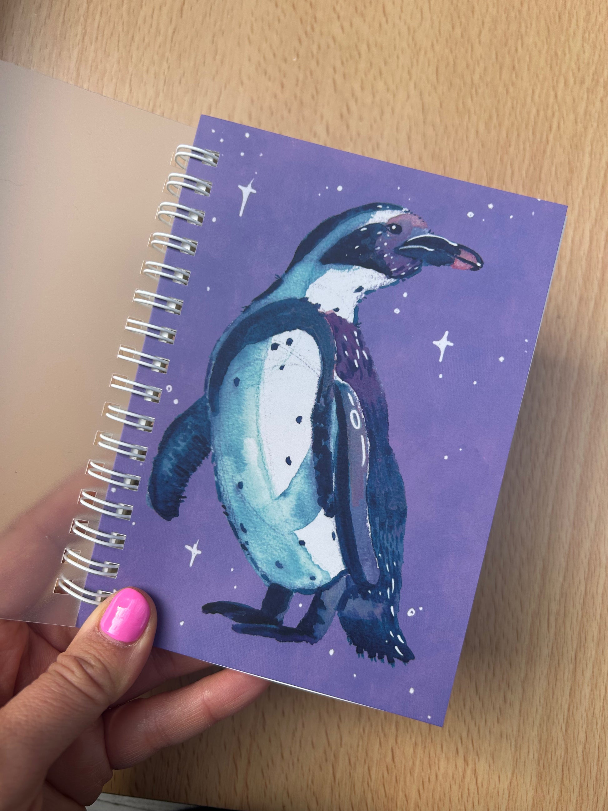 A6-os méretű spirálozott notesz sima oldalakkal: rajzoláshoz, jegyzeteléshez. Borítóján egyedi, japán Gansai Tambi vízfestékkel festett "Magellán-pingvin" illusztráció. A külső borítót egy plexi lap védi a gyűrődéstől, kosztól.