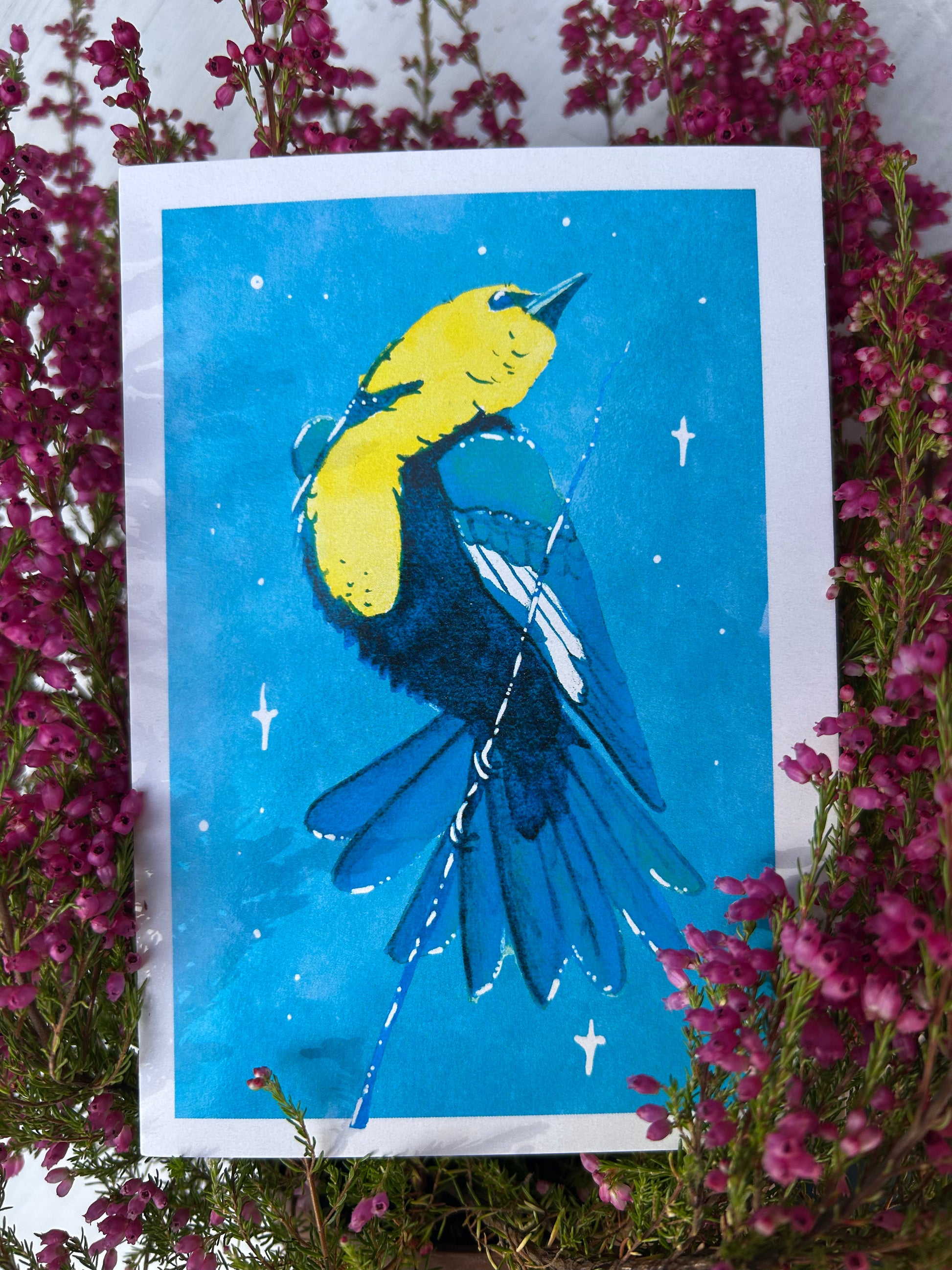 Egyedi, japán Gansai Tambi vízfestékkel festett "Sárgafejű csiröge" képeslap.